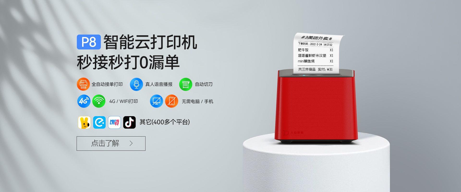 大趨智能,創立于2016年,位于深圳市南山區,注冊資金2000萬元,是國內領先的智能支付解決方案供應商,專注外賣云打印機,熱敏打印機,票據打印機,藍牙打印機,wifi打印機等智能云打印機設備。 旗下品牌小店掌柜主要致力于為中小微商戶提供SaaS服務一站式解決方案,具備業內獨有的多項聚合功能,主要包括掃碼點餐、自營外賣、聚合外賣、聚合管理、聚合營銷、聚合配送等服務,助力商戶低成本實現高效經營,形成互利共榮的一體化生態系統,提升收益與效率。